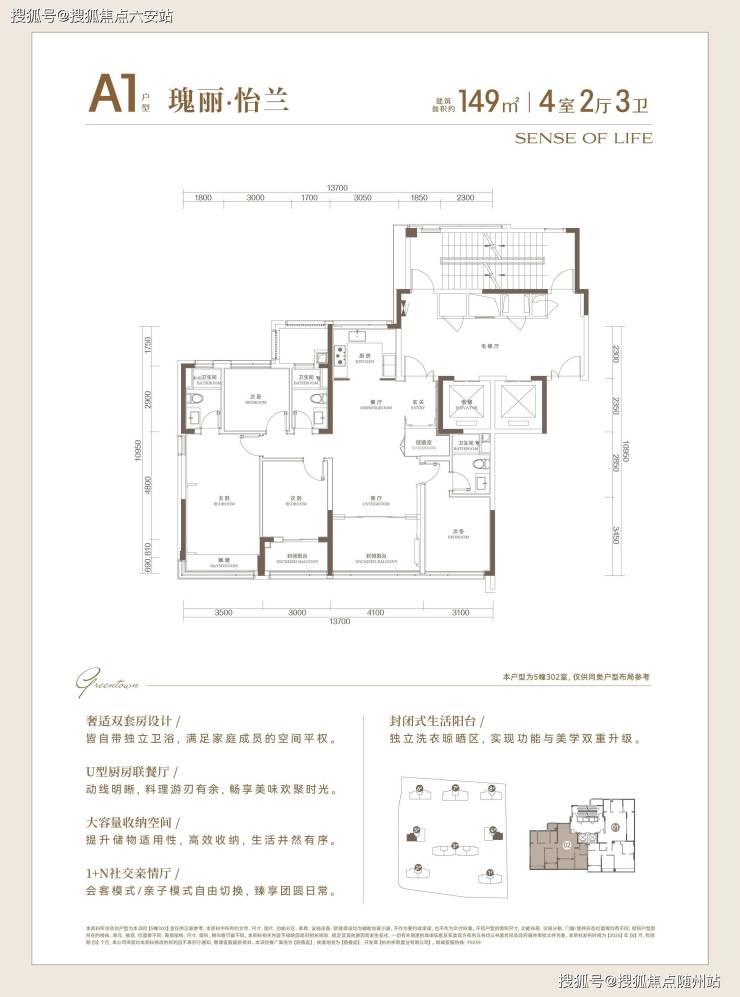以149㎡四房两厅三卫户型为例,实得率约85%,四开间朝南设计让居住空间更加宽敞。170㎡户型实得率高达93%,双阳台设计让居住体验更加宜人。185㎡户型具备双套房设计,兼顾家人私密性与舒适度,适合多代同堂家庭。