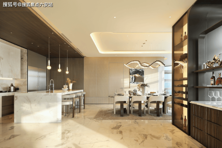 约200方会客厅高约3.7米,营造高厅阔邸,约24米落地窗带来270°视野。2.9X1.55米超大岛台重定家庭社交中心,专为习惯国际顶豪生活的客户设计。