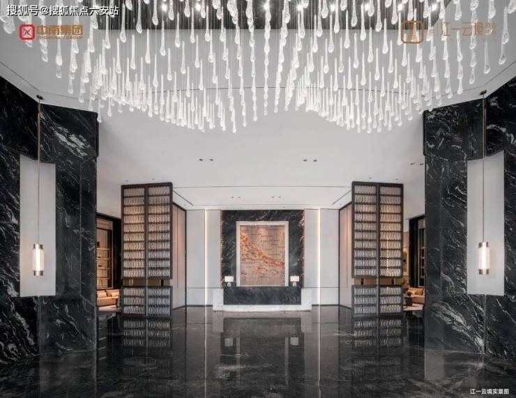 作为围合式的原生大平层,江一云境以打造国际绿色健康奢宅为理念。穿过中轴对称的大门,便是江一云境重金打造的三重五星级酒店入口。约6米的挑高下,墙面铺装香格里拉酒店专用的黑荒料奢石,地面用的是碧潭金沙,营造出考究、厚重内敛的奢华感。