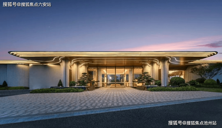 门前两棵罗汉松;园区内的中央园林围绕新型蓝宝石戏水池打造,营造澜韵迎宾、松鸣涧语、鸣泉叠韵、鸣芳拾趣、鸣香径幽等九境空间。