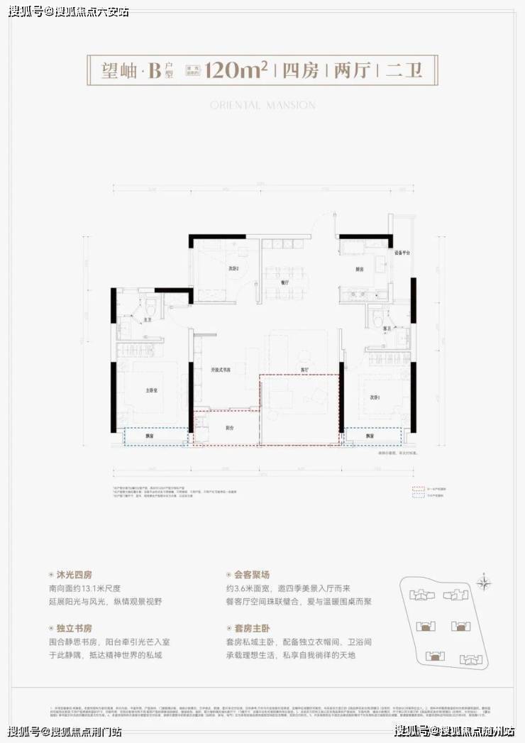 建面约120方户型:这款户型设计非常不错,在这个120方的面积段里不仅做了四房设计,而且还是四开间朝南,南向采光非常好。