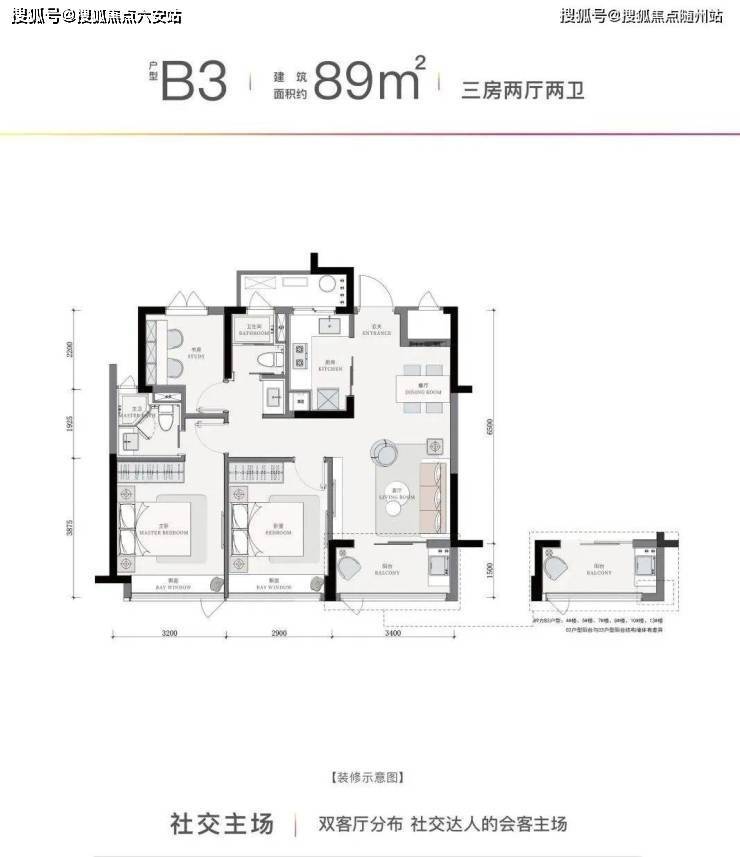 建面约71㎡的两房户型将开放式厨房与泛客厅相连,从餐厨、客厅到阳台形成通透空间。而建面约89㎡的三房户型,三开间朝南,设计出了两条平行生活动线,巧妙地形成了一家人共聚的公区,以及由主卧、套卫、书房的“第二客厅”。
