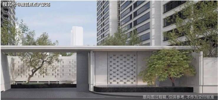 项目西侧主入口是一个宽约35米、高约5.5米的“静藏琉光”大门,景观墙层叠错落,高挑檐顶搭配古朴铜门,宏伟中透着灵动的艺术感。