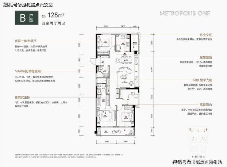 约128平方米的户型提供了宽敞舒适的居住体验。其四房边套设计不仅优雅且实用,餐客厅一体化布局配合飘窗,不只拓宽了视野,还为家庭聚会创造了理想空间。