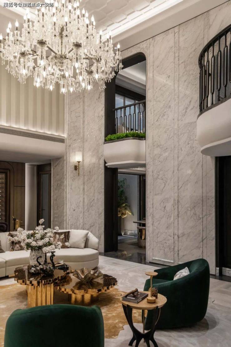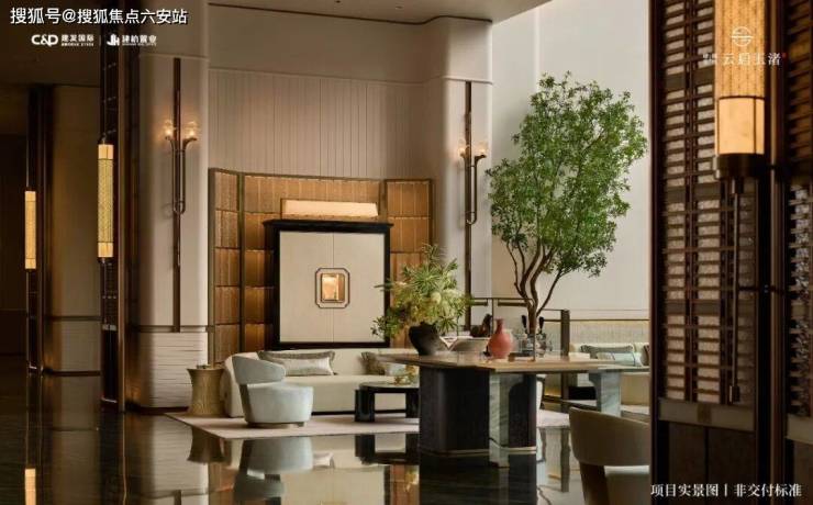 屋檐取形北京太和殿庑殿顶,融入良渚高台夯土文化,搭配铜狮、涌泉、五步青云阶,辅以琮黄色调装饰,营造归家非凡礼遇。