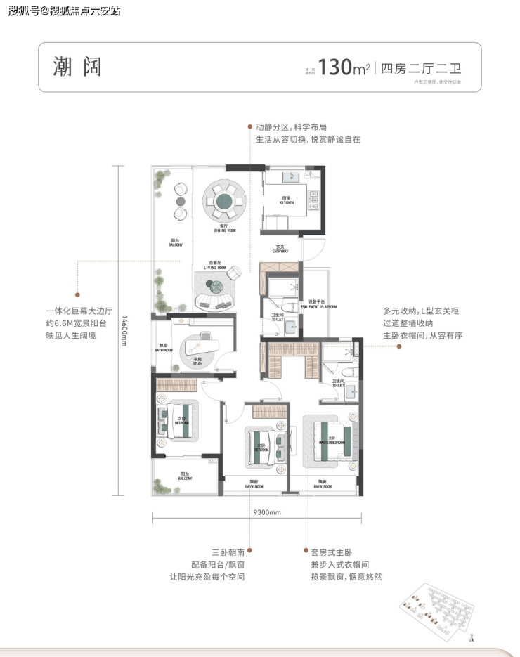 揽景小高层建筑面积约105-130㎡,为最大化景观面,突破性设计建筑面积约105㎡南向四开间。
