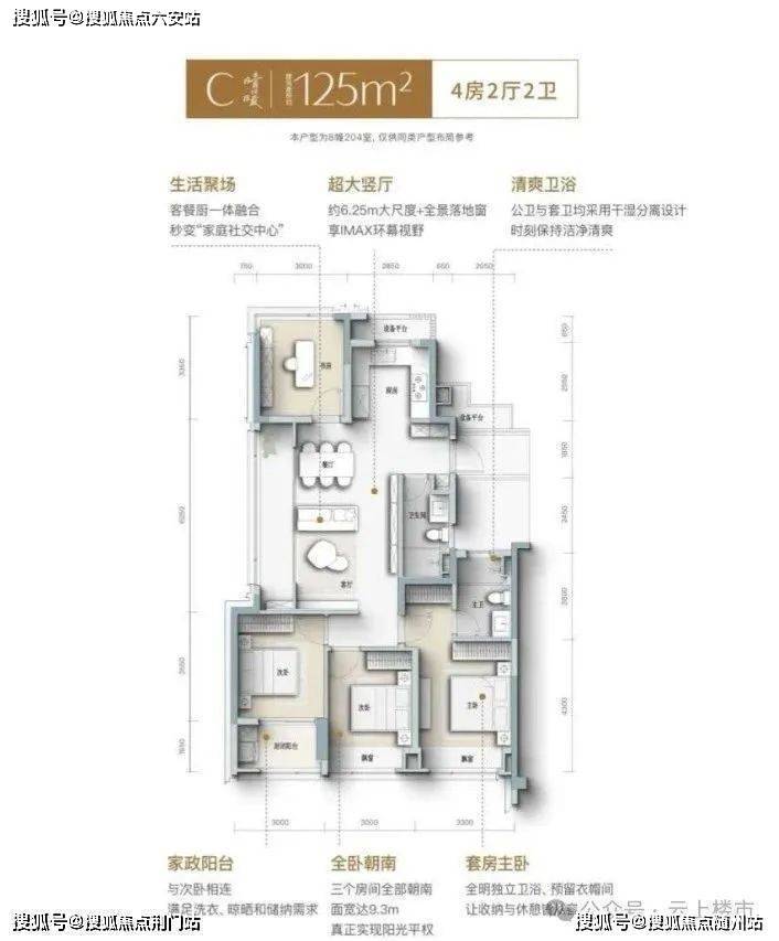 约9.3m南向面宽,全卧朝南,让每一室均享阳光的平等眷顾;