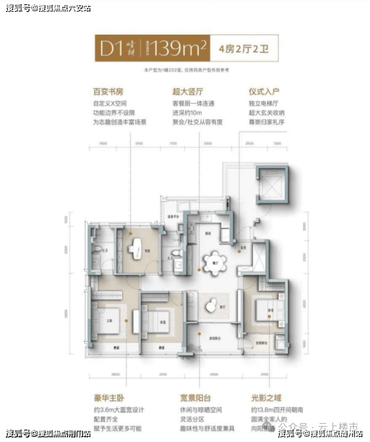 T3 大高户型则胜在 “灵动空间”,书房白天是阅读角,晚上可变童趣天地,收纳随功能切换而调整。约 13.8 米南向四开间让阳光满屋,客餐厨一体化设计进深达 10 米,聚会娱乐从容自在。主卧约 3.6 米宽敞面宽,精致衣帽间与独立卫浴俱全,满足改善家庭对 “奢享” 的需求。