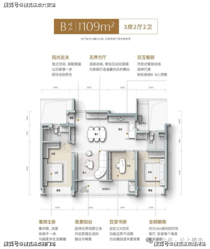 主卧套房配备卫浴、衣帽间与飘窗,晨起护肤品与睡前读物各有归处;双阳台与多飘窗的“赠送空间”,让实际使用面积远超预期。格局上做到方正通透、动静分离,无论是二人浪漫派对还是二孩家庭的热闹日常,收纳系统都像 “隐形管家” 般维持秩序感。109方B1户型更是做到大面宽,四开间朝南,把阳光塞进每一个房间。