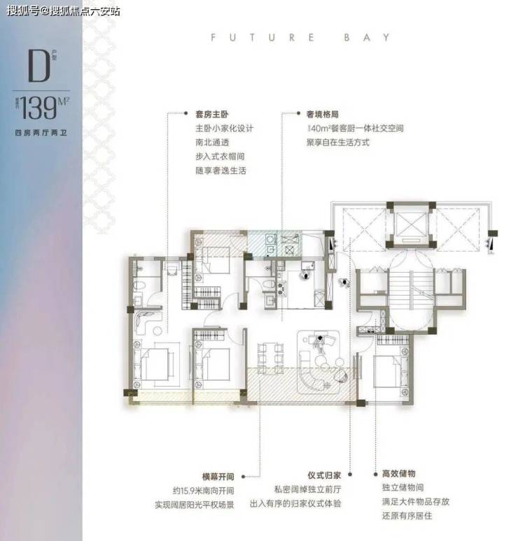 约139方户型, 4.5开间朝南+储藏间,南向15.9米超大采光面,做到五开间朝南的空间,标配储藏间,三个南向卧室设计。