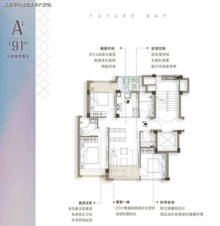 建面约91方真三房户型,真南北通透洋房产品北侧无消防连廊设计,小面积也是真南北通透,区别市面2+ 1户型,最小的卧室也有将近9个平方,每个卧室面宽均达到3米及以上
