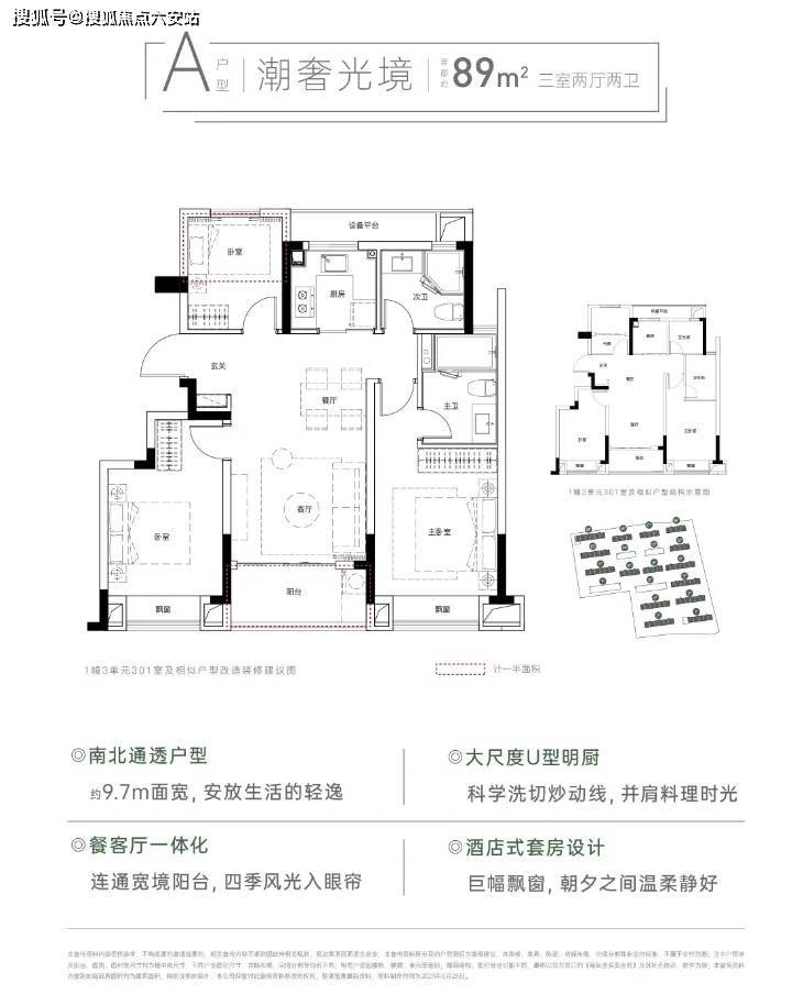 建面约89㎡三房两厅两卫设计,即便最小的房间也能作为卧室使用,是真正的三房户型。全明设计,南北通透,三开间朝南,南向采光面长约9.7米。主卧套房,格局相当阔绰,含飘窗面积约20㎡。
