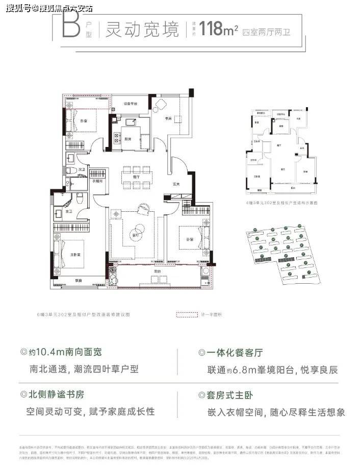 建面约118㎡四房户型, 经典四叶草全明户型,动静分区,南北通透,南向开间约10.4米。