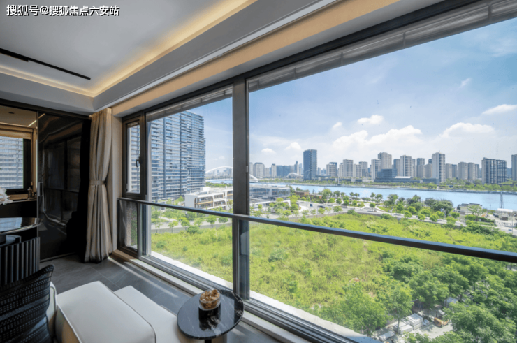项目采用玻璃幕墙+香槟金铝板立面,顶部退台设计形成阶梯式天际线。部分楼栋间距近百米,打造“阳光穿堂过、江风拂面来”的奢适体验。约4.1万㎡园林以“一轴三园七景”布局,融合ANDAZ酒店风格,设蓝宝石泳池、下沉式私宴庭院及700米滨江慢跑道,实现“推窗瞰江、下楼即园”的微度假生活。