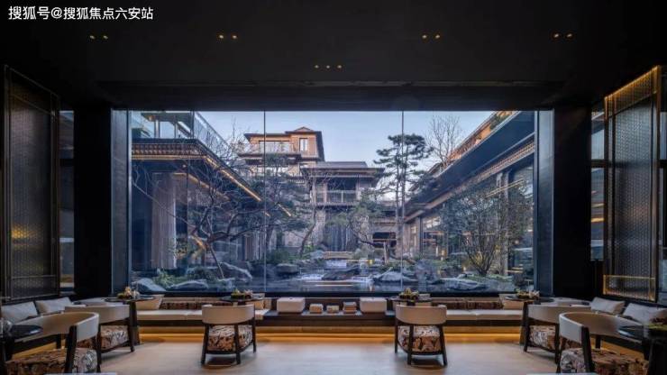 在材料运用上,建筑形制与现代工艺深度交融——黛墨青瓦与大面玻璃碰撞出时空对话,铝板的现代质感与石材的厚重肌理相得益彰,共同勾勒出巨幕玻璃框景的金线建筑,让传统符号在现代工艺中获得新生。