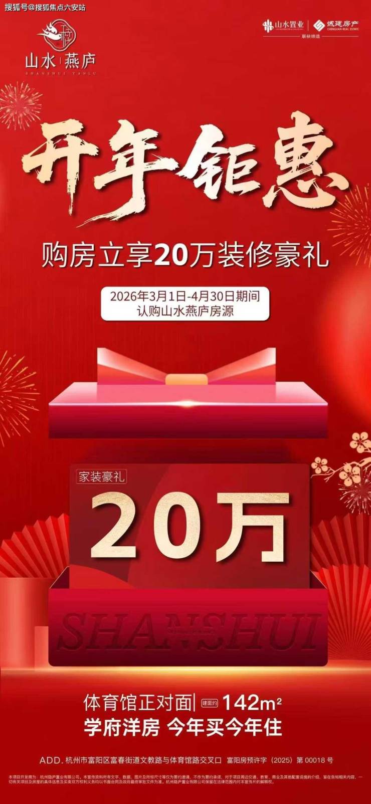 在富阳富春主城核心,文教路与体育馆路交叉口的黄金地段,一处能兼顾都市繁华与低密静谧、承载精英家庭栖居梦想的品质住区——山水燕庐 ,正以匠心姿态,诠释理想人居的全新模样。作为富阳主城稀缺的低密改善大盘,项目坐拥双名校加持、全维成熟配套,毛坯交付赋予居住无限可能,即将于2026年6月交付,实景可期。