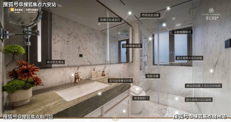 还不止,大到豪宅才有的嵌入式冰箱,小到顶喷花洒、主卧镜柜里的美妆冰箱等,都是交付标准,就连次卫也首次配置上了智能马桶;不断映入你眼帘的,还有各种木饰面、奢石、岩板,以及定制款龙头、门把手.....