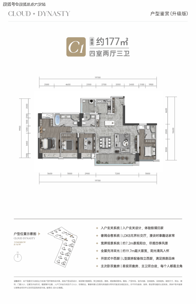 • 169㎡经典云端大宅:4梯2户配置,LDKB一体化客餐厅,主卧双台盆+独立衣帽间,满足四代同堂品质需求。