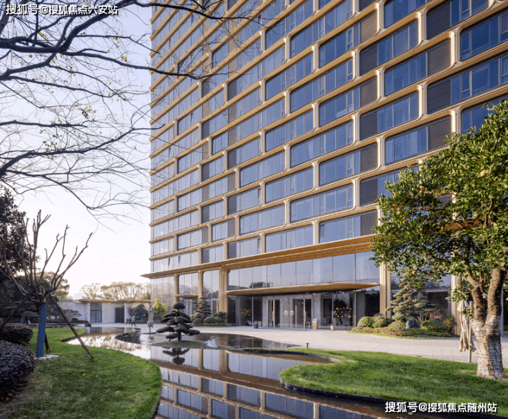 外立面以金色铝板曲面线条呼应钱塘潮涌,搭配三层中空LOW-E玻璃幕墙
