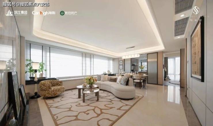 但是它更大的升级,更大的诚意,在超标的精装配置上:客厅这些圆润的尼斯木饰面、布艺软包的护墙板,甚至是主卧定制的皮革背景墙全部都做好了。地面是两种大理石的拼接,电视背景采用鱼肚金石材,你看到的墙面、地面甚至天花都是圆弧形的。