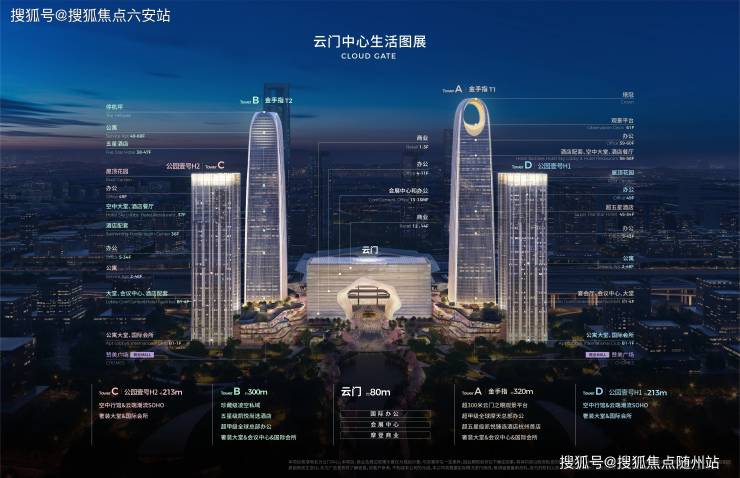 地标价值不仅体现在建筑高度上,更表现在设计创新上。核心地标“云门”由程泰宁院士设计,长180米、高80米,以良渚玉琮为原型,采用10,483块仿玉陶瓷玻璃幕墙,与西站枢纽无缝衔接,兼具商业、文化展示功能。塔楼顶部云眼设计,勾勒出面向未来的新标识,而“金手指”超300米塔冠之上设计的云门之眼观景台,为全球来客预留了俯瞰杭州的绝佳视角。这些设计元素共同塑造了云门中心作为杭州新名片的形象。
