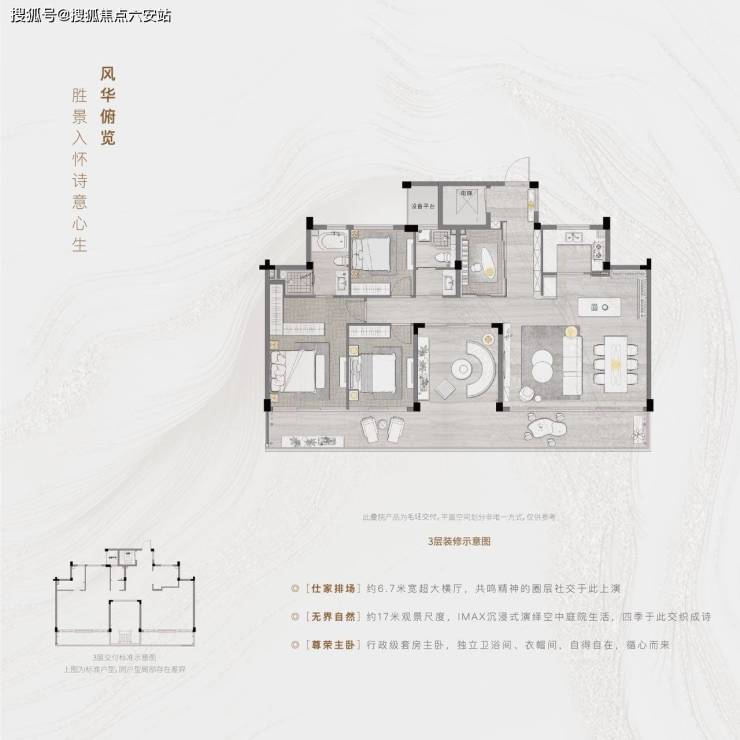综合得房率约110%,空间尺度媲美270㎡大平层!约17米IMAX级别星幕露台,约20-35㎡挑高地下室,独立入户花园。