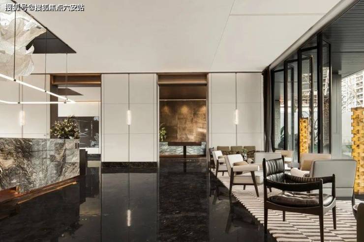 为了实现尊贵雅致的归家仪式感,打造“五境归家”动线,约37米延展面的府院式大门、约4米挑檐星空顶及尊贵酒店式落客和parda绿奢石,勾勒出每一步皆静奢的归家质感。而在入户电梯厅,经典纹样的瓷砖拼花,搭配雪山银狐岩板和精美壁灯,让业主的每次回家都被温馨氛围包裹。