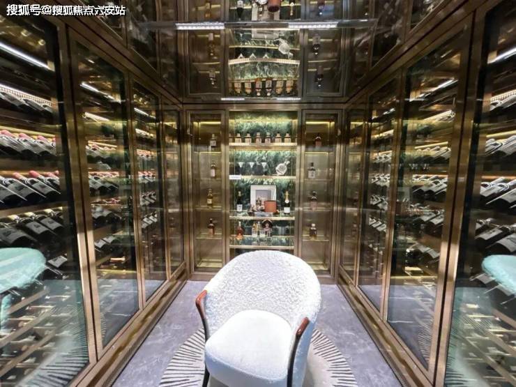 从静心凝神的茶室走几步,就到了藏酒饮酒的开放式会客空间,墙上橱柜码着主人从各处精心搜罗回来的上等佳酿。