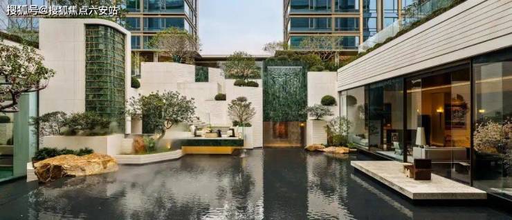 奢石、叠水、层层绿植与雕塑高低错落,最特别的是,一道叠瀑直接从建筑立面上倾泻而下。