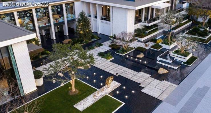 走近沐芳洲,首先映入眼帘的不是冰冷的大门,而是一座长卷般的艺术前场。设计师在这里奢侈地造了一个宽约150米、纵深约36米的超级水院。