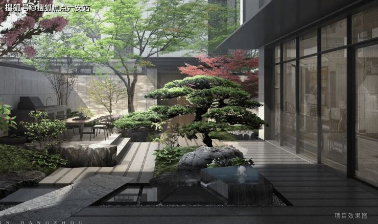 楼下,是环绕式前庭后院设计,山石、亭台、池塘、溪流与小道自然交融,在主城区土地日益紧缺的当下,拥有一方独立的城市院子City yard当是无与伦比的享受,邀上三两好友,或烹茶煮酒、或谈说风云,是极少数人方能拥有的生活。