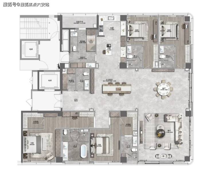410㎡“湾潮”户型:WSD世尊主笔,4套房+保姆间设计,法式艺术走廊与双衣帽间主卧]。
