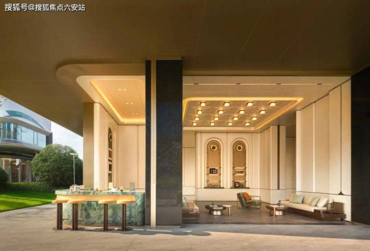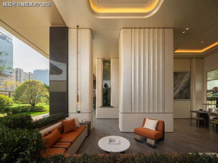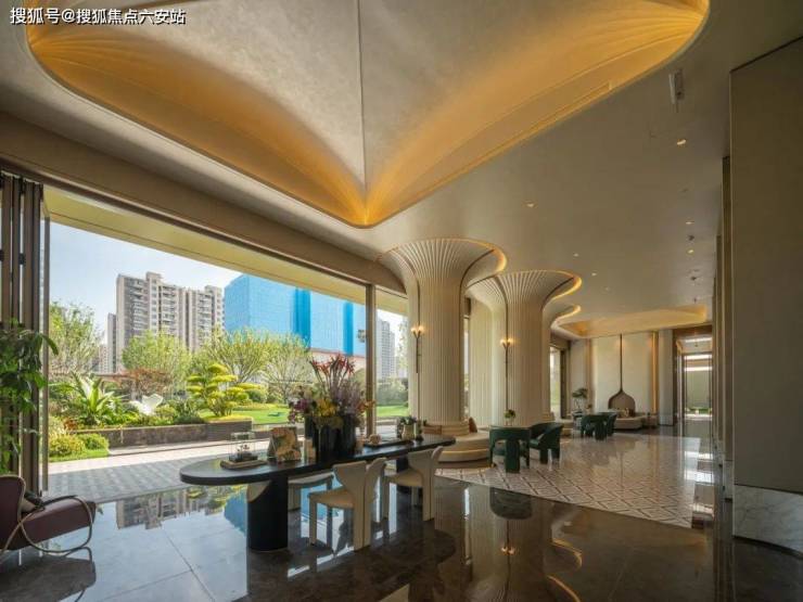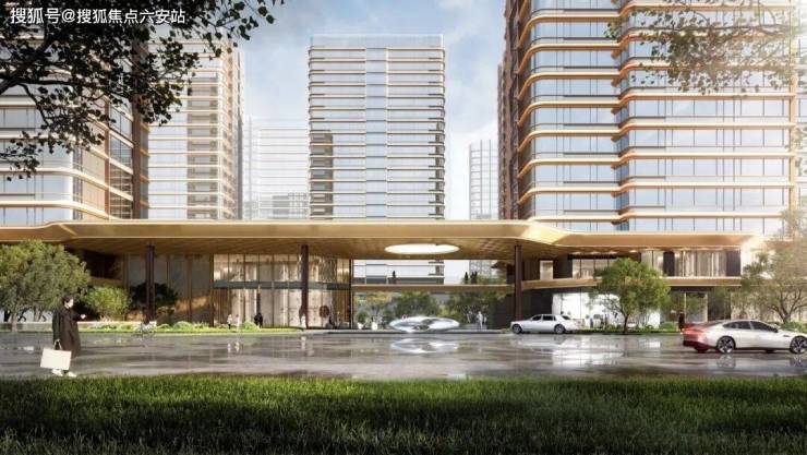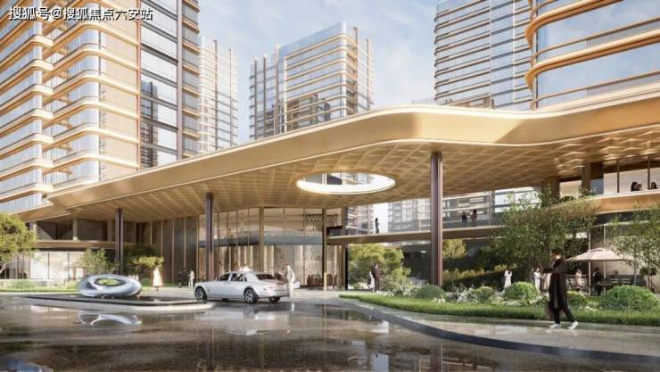 GAD大师张微以“科技+生态”为设计理念,将未来感弧线融入城市肌理:70米宽、9米高的鎏金天幕入口采用偏置大堂设计,顶部圆形镂空让光线穿透,将社区立体花园与城市界面自然衔接,形成“你站在桥上看风景”的互动美学。