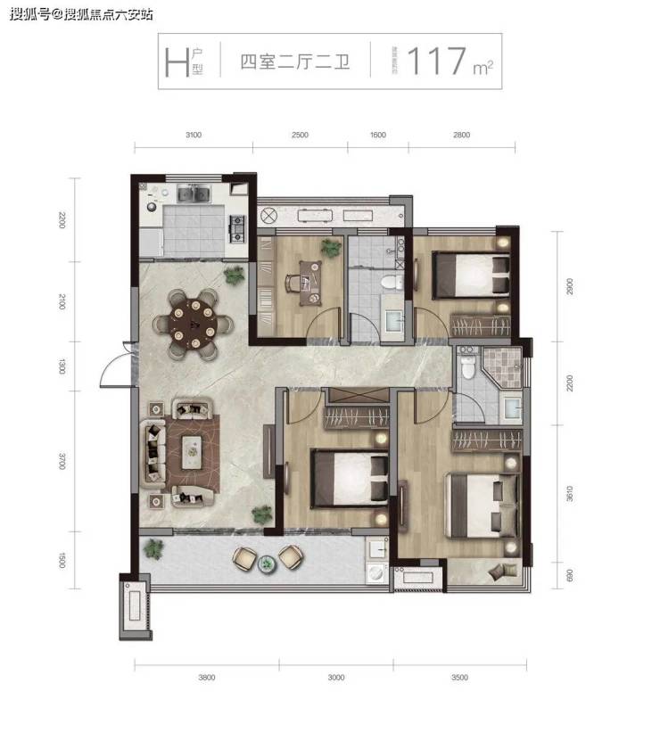 H户型 奢璟 建面约117㎡ 四室二厅二卫