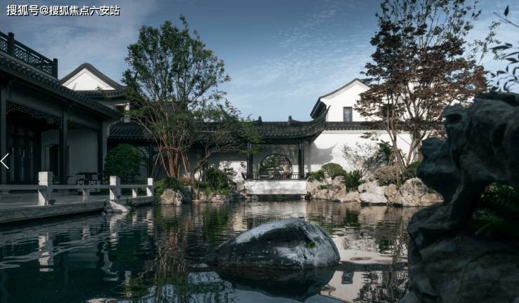 江南园林甲天下,苏州园林甲江南,比如像我们现在看到的园林布局,就是经典的苏州园林景观,讲究引水入园。造景围绕着这片水景展开,空间上比较有层次感。近景是流水、堆石,中景是连廊、假山,远景是中式合院的院墙、屋檐。