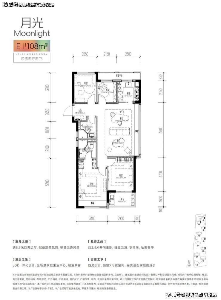 270度环绕式采光,视野绝佳;主卧独立卫浴、走入式衣帽间、南向阳光飘窗,享优雅随心的寝居感受;阔约5.9米带飘窗的边厅,与带大开窗的厨房无界联通,加上独立玄关,4房功能齐备。