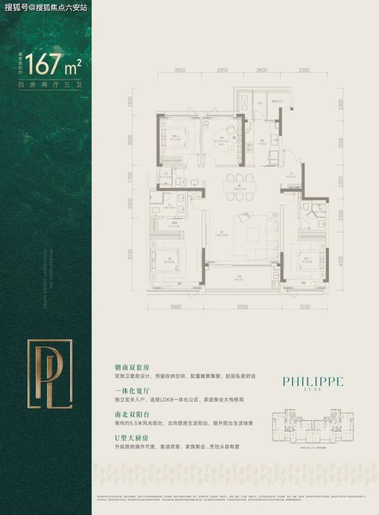 建面约167㎡南厅户型,四房两厅三卫,两梯两户,客厅南向开间5.5米,主卧开间3.9米,厨房北侧还配有小面积阳台。🔻售楼热线:☎ 400 832 8823「售楼处」☎〢网上售楼中心〢🔻