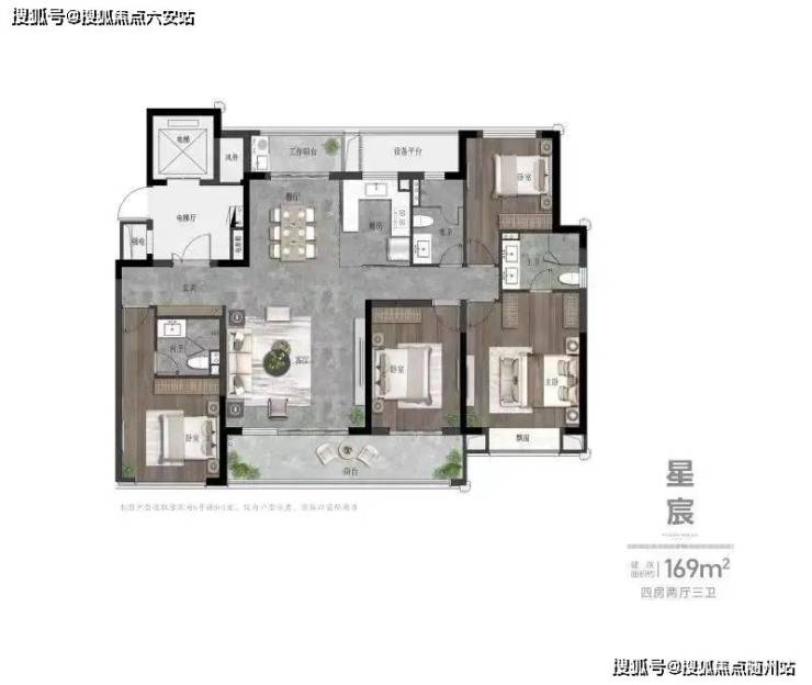 最后,我们来看看伟星·星润名著的尊享级户型,建面约169㎡四房两厅三卫户型。