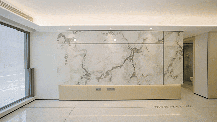 一梯两户下,入户是玄关,做了定制玄关柜,体面归家。这个玄关柜的收纳能力很大,挂衣区、行李收纳位、岩板置物台。