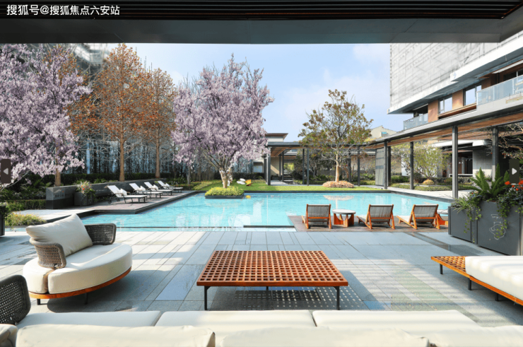 南北景观中轴,串联起园区十大活力场景:湛蓝的景观戏水池,水岸布置茶几和休闲躺椅的云影客厅,种上一大一小两颗樱花树,松弛度假感直接拉满,随手一拍就非常出片。亲子乐园的大草坪和儿童游乐场,是周末溜娃最好的场所。养宠物的年轻人,则可以相聚在爱宠基地,开启毛孩子的社交……