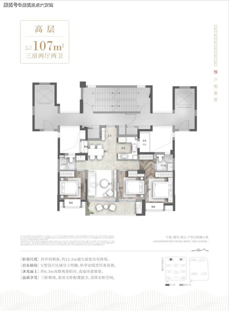 高层107 户型:四开间朝南、正三房、双套卧、无暗间