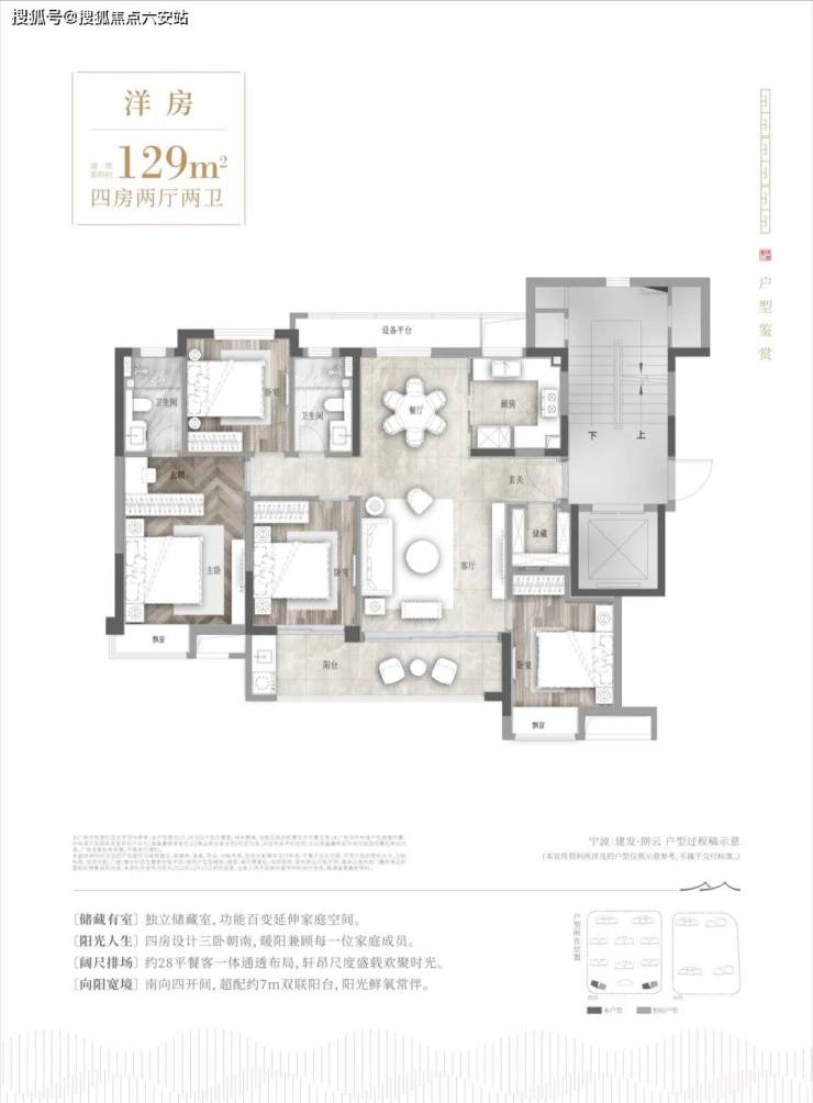 洋房129户型:四开间朝南、独立储藏、可放圆桌、正四房