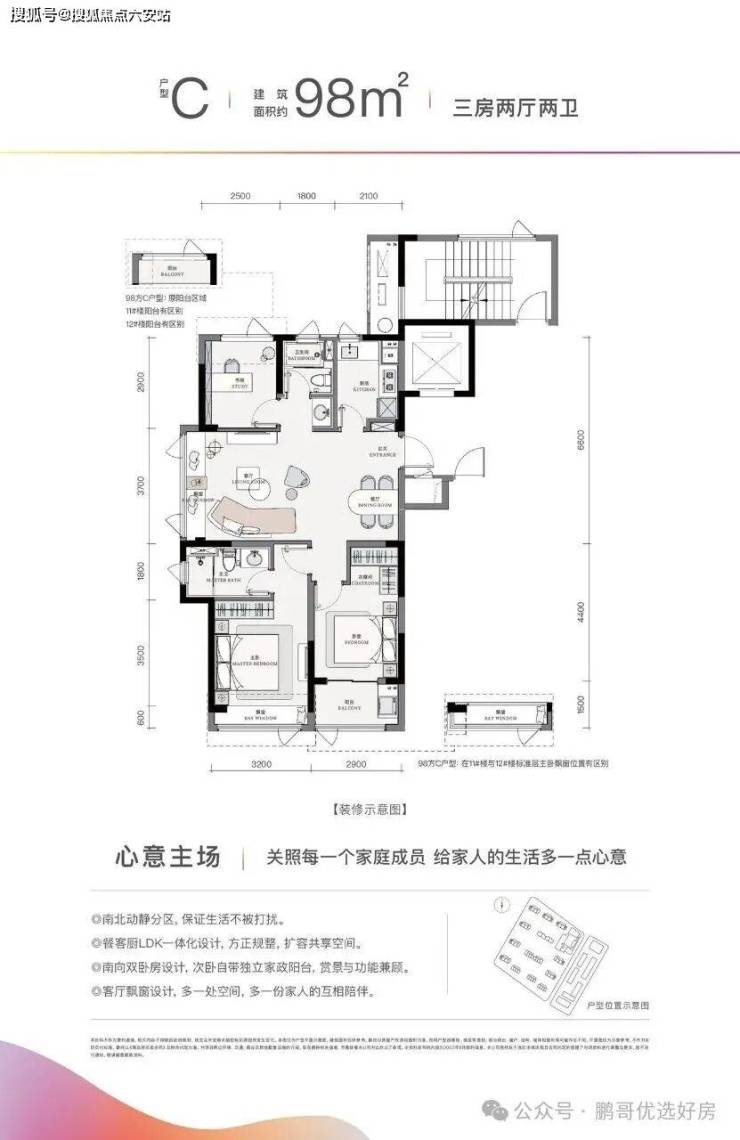 南向3个开间的设计,让整个室内非常亮堂。三房两厅两卫的功能,动区空间大,还做到了双飘窗大阳台,可以很好地满足二娃家庭或者长辈同住的生活需求。