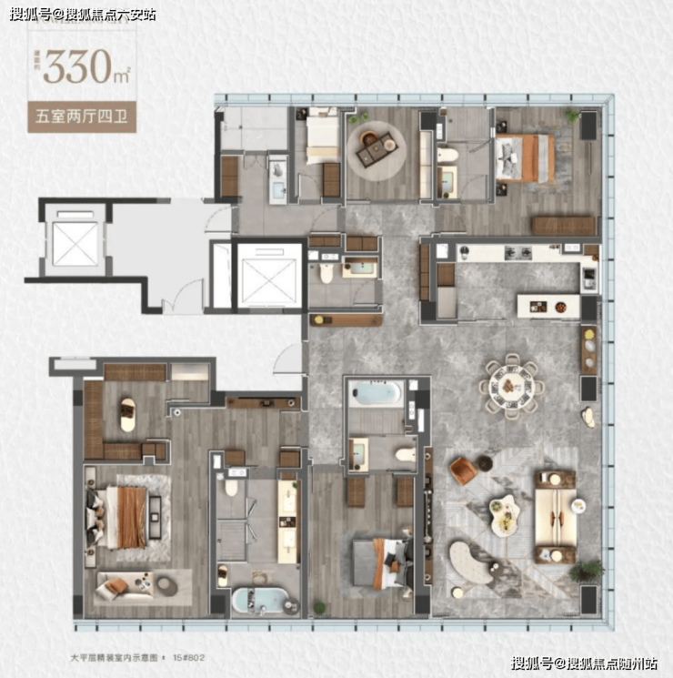 其余卧室也多采用套房设计,保障了家庭每位成员的独立性。动线规划清晰,将公共的社交区与私密的休息区巧妙分离,做到了“动静分区”、“干湿分离”,既适合大家庭共同生活,也胜任高规格的商务接待。