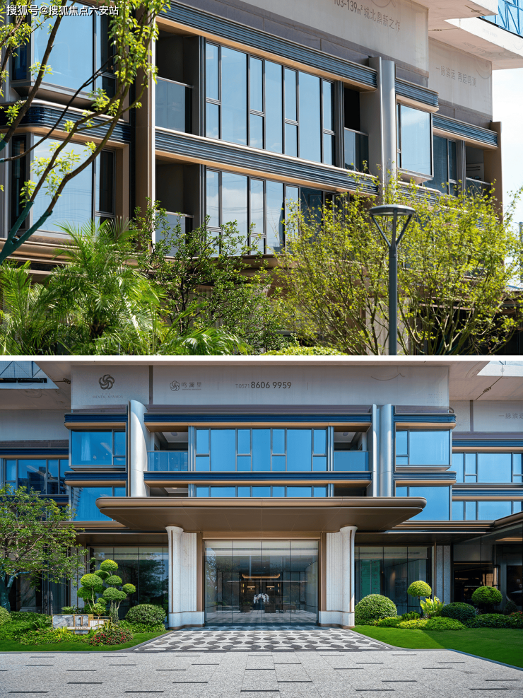 主体建筑运用大面玻璃、铝板、铝线条和石材等为辅描绘“金色画框”,顶部融合比例美学与圆弧转角工艺,勾勒超流线动感“云冠”造型。建筑层间以“景泰蓝”千年艺术为灵感,辅以层层线脚形成独特的东方美学语言,蓝金组合彰显华丽。呼应在美学空间的生活场域中,构建出轻奢尊贵的建筑气质,每一处设计都诉说着关于家的高阶想象。