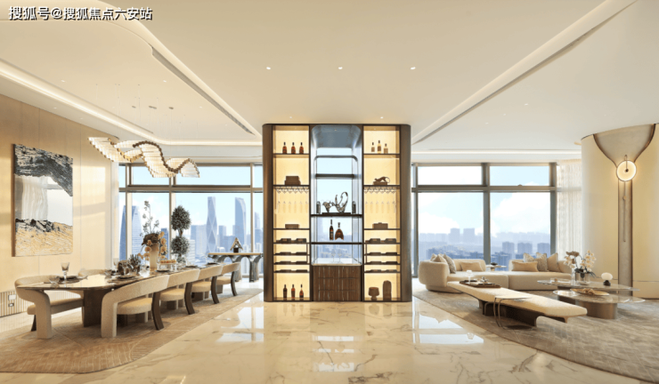 引入无边界理念,打造客、餐、西厨一体化的约200方超级会客厅,以超大岛台重定家庭社交中心,以通顶酒柜、开放式书房&茶室,丰富私人酒会、家庭派对等生活。
