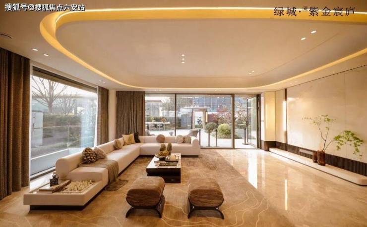 外立面采用香槟金铝板与曲面玻璃,造价高;下沉式会所种植350年树龄紫薇老桩,景观品质突出。