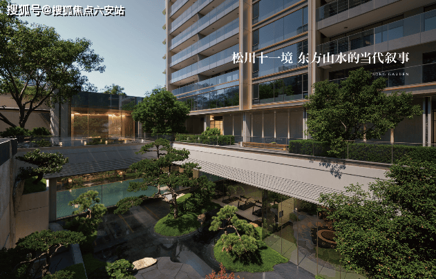 东方美学设计:以北宋名画《溪山行旅图》为灵感,打造“松川九境”园林景观,包含约3300㎡中央庭院、7米流瀑、6棵造型黑松等元素,营造诗意栖居氛围。