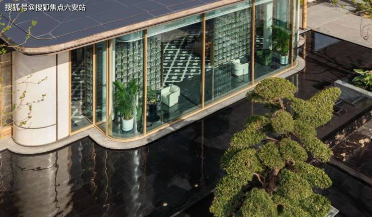 立面方面,汲取现代轻奢法式的白金美学灵感,叠加大面玻璃,打造出光影灵动的对称式金色画框立面。