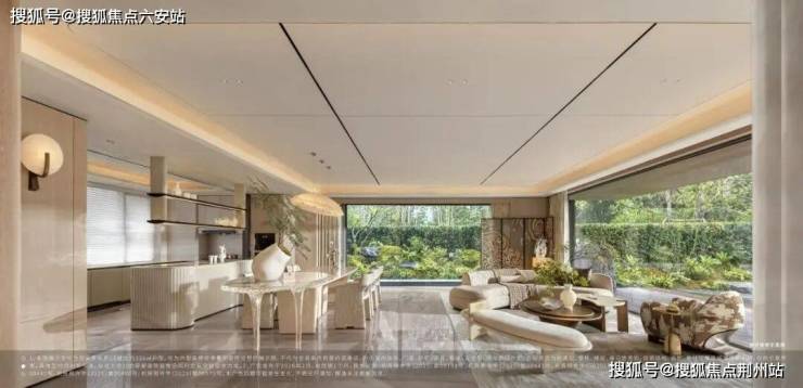 整个餐客厅面积超过75㎡,由曲面落地玻璃门窗围合,外面就是凌空于中央庭院之上的浮岛式阳台。